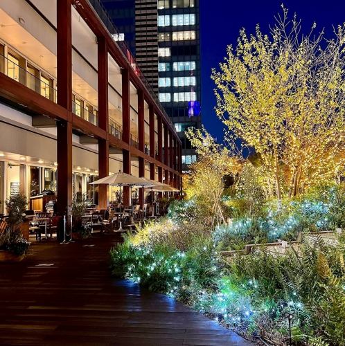 人の心を奪い、心を揺さぶる美しい空間。店内からはイルミネーション輝く、照らすをご覧いただけます。都心の喧騒を忘れさせてくれる、緑豊かなガーデンが広がっています。